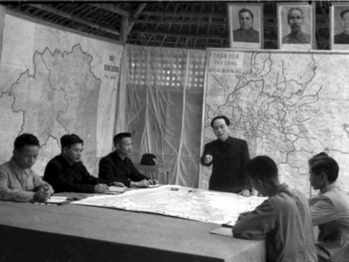 Le général Vo Nguyên Giap (debout) lors d'une réunion sur la bataille de Diên Biên Phu. Photo : Archives VNA/CVN